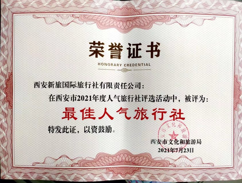 旅行社简介: 西安新旅国际社地处西安钟楼商圈,是一家综合性旅游企业。先后组织接待了众多大型旅游团队,得到国内外游客和同行的好评!近年来企业规模不断壮大,分公司遍布四川、甘肃、新疆、陕西、内蒙、青海、贵州等省。主营滨海度假、草原休闲、山岳探险、乡村民俗、红色旅游线路等。其中红色旅游线路涵盖省内所有红色景点及省外主要红色景区,接待并服务过近百家企事业单位。我社将继续开发设计高质量旅游产品并提供全方位、多元化、高层次的服务。